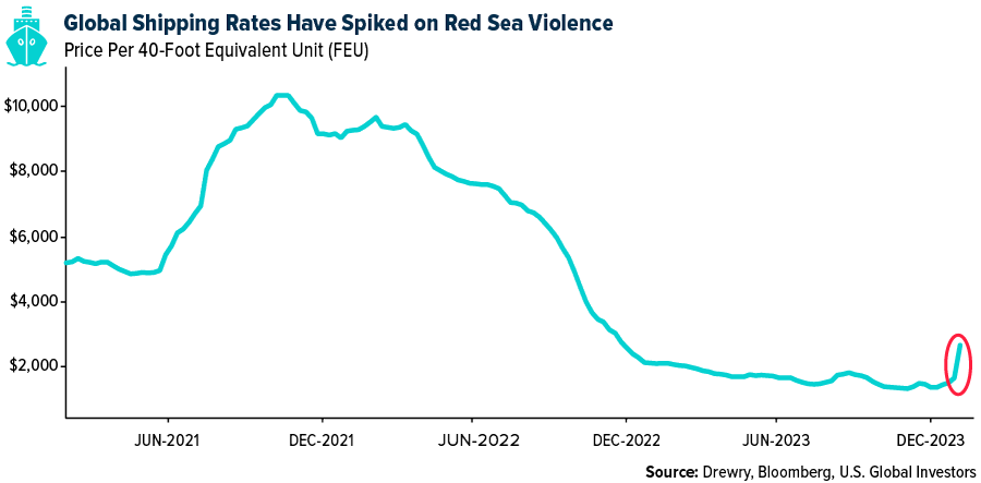 Growing tensions in the Red Sea, a crucial artery for international trade, have sparked a significant shift in the shipping industry. This shift, we believe, offers a compelling case for global shipping stocks. The detour has had an immediate impact: soaring container freight rates. Since tensions escalated last month, global rates have nearly doubled, a clear indicator of the increased costs incurred by carriers and passed on to exporters. Shares of shipping companies have also jumped as a result.