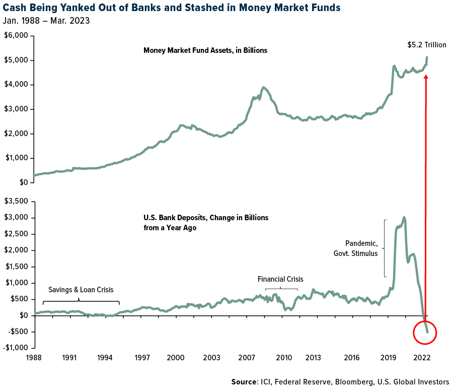 Where is all this capital going? Money market funds, which are perceived to be safer and, in many cases, deliver higher yields than savings accounts right now. A record $5.2 trillion now sit in these funds, according to the Investment Company Institute (ICI), and the stockpile is expected to get much higher.