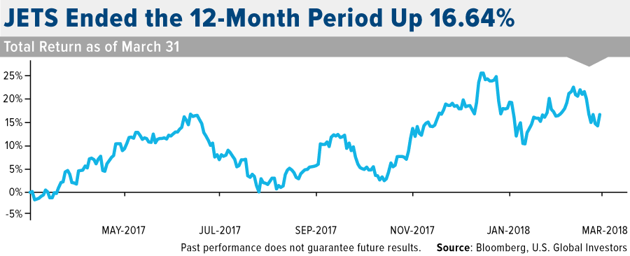 For the 12-month period as of March 31, the U.S. Global Jets ETF (JETS) returned 16.64 percent, beating the S&P 500 Index, which gained just under 14 percent for the same period.