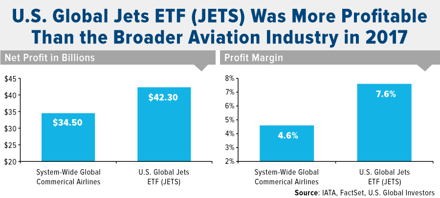 The companies held in our U.S. Global Jets ETF (JETS) were far more profitable than a broader basket of global commercial airlines in 2017, implying superior stock selection. The International Air Transport Association (IATA) estimates that system-wide commercial airlines across the globe netted $34.5 billion in profits with a 4.6 percent profit margin. JETS, by comparison, ended the year with more than $42 billion in profits and an impressive 7.6 percent profit margin, 300 basis points above the broader market, according to FactSet data.