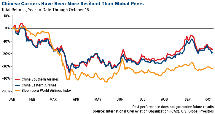 Although shares of China Southern Airlines, the largest carrier in Asia by passengers served, and China Eastern Airlines were down 20.4 percent and 23.7 percent year-to-date as of October 16, that was about half as much as the decline in the Bloomberg World Airlines Index, down 40 percent over the same period.