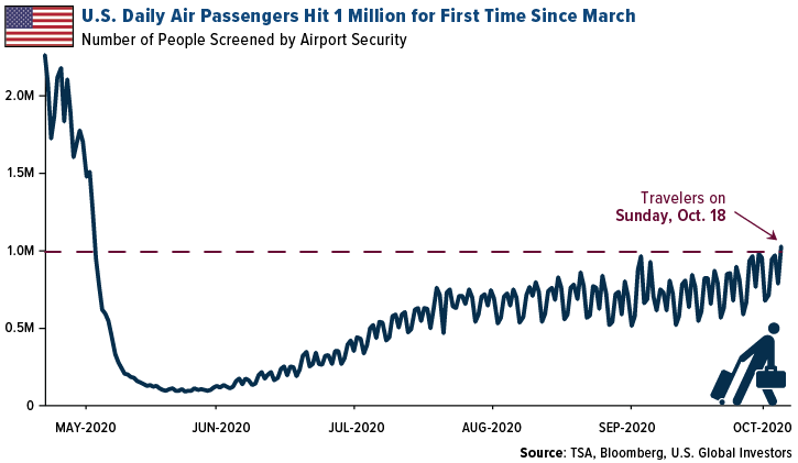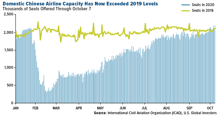 We believe one of the most attractive ways to play the economic recovery from the pandemic is with global airline stocks. From its low on May 15, the U.S. Global Jets Index has already recouped 51 percent as of October 20. It’s still 44 percent below its all-time high on January 17 of this year, so there may still be time to participate.